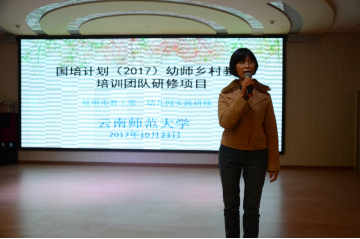 2017年10月10日至29日,“国培计划(2017)”乡村幼儿园教师团队研修项目在云南师范大学开展。在前期理论学习、专题培训讲座的基础上,10月23日,在傅淳教授的带领下,国培学员一起走进昆明市教工第一幼儿园新迎园区,进行了优质音乐教学活动、区域游戏活动观摩,参与了园本教研活动。